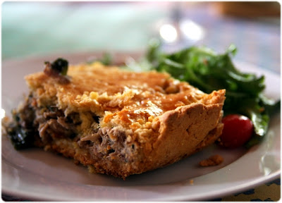 Cette recette inspirée des traditionnelles "empadas" açoriennes est de l'autorité d'Eduardo Reis, un monsieur qui doit sa réputation aux délicieux petiscos - ou tapas - qu'il avait l'habitude de servir dans une célèbre tasca de bord de mer, à Porto Martins - la commune où j'habite. Entretemps, le bistrot a fermé ses portes, mais personne à Terceira n'a encore oublié les merveilleux petits plats que l'on y confectionnait, au point que la chaîne RTP Açores leur a consacré une série de douze émissions intitulée Sabores do Atlântico, où Eduardo Reis en personne cuisinait les meilleurs produits des Açores, en pleine nature, devant les caméras, avec pour toiles de fond les magnifiques paysages des îles du Groupe Central. La tourte présentée ici est un bel exemple de comment faire évoluer de forme créative une recette régionale traditionnelle en mettant l'accent sur des produits locaux - dans ce cas, le lapin sauvage qui abonde sur tout l'archipel et la tétragone, une sorte d'épinard sauvage qui pousse à profusion entre les roches du littoral. La pâte - assez friable et cassante - demande de la délicatesse dans sa manipulation. Sinon, nul besoin d'être un grand chef pour réussir cette excellente tourte.